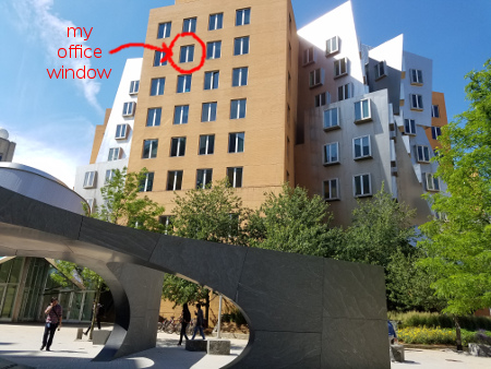 Step 2: Know that the Stata Center has two towers, Gates and Dreyfoos. The "G" in my office number 32-G842 indicates that I'm in the Gates tower. The building has a few entrances, but the main one (the one closest to foreground in the above photo) is nearest to the intersection of Vassar Street and Main Street. Near this entrance is a large gray sculpture, shown in the photo. This entrance naturally takes you underneath the G tower as you walk into the lobby, and the first elevators you come to go up into G. The two towers are not linked on all floors (mine is a floor without a link), so going up into the wrong one is the number one way to get lost.